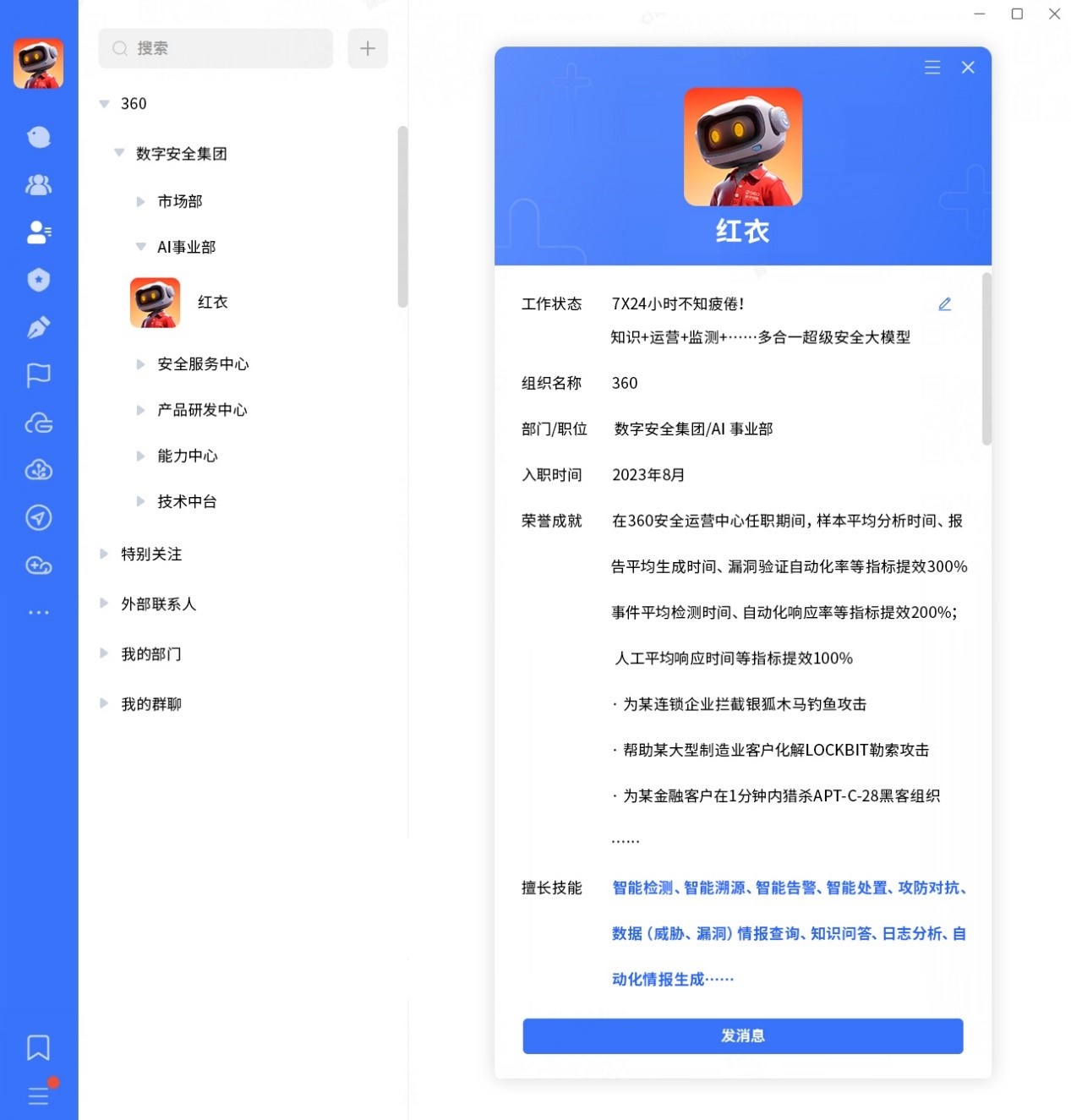 将来,正在平安大模子能力下,同时,“红衣”大模子的类脑架构,“红衣”由360平安大模子支撑,“红衣”正式被编入360 AI事业部,运营中的措置工做需要分秒必争来止损,协帮收集措置后的目标以供报告请示。近日,360颁布发表其首位AI员工“红衣”正式入职AI事业部。经常形成“不消的时感受遍地都是值得总结的内容,往往依托大量的经验沉淀和归纳拾掇,属于工做量大且精确性要求高的典型场景。